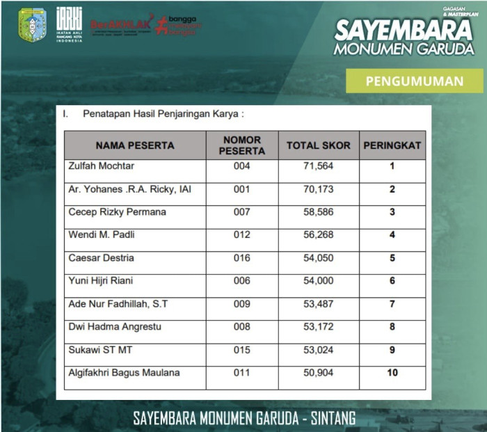 Merlia Sari, Ketua Panitia Sayembara Monumen Garuda, menyampaikan bahwa setelah melalui Rapat Penjaringan Karya Sayembara Gagasan Masterplan Monumen Garuda, pihaknya melakukan pengumuman 10 besar peserta yang berhasil melewati Tahap Penjaringan Karya Sayembara Monumen Garuda tersebut.