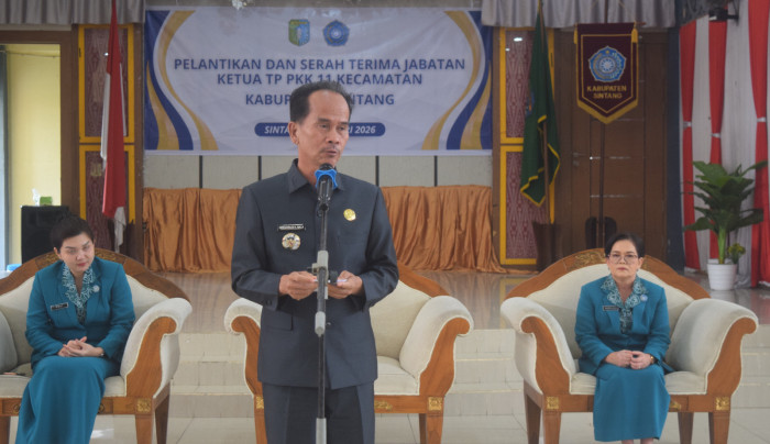 SINTANG, TB – Bupati Sintang, Gregorius Herkulanus Bala, memberikan arahan usai pelantikan 11 Ketua Tim Penggerak PKK Kecamatan yang berlangsung di Pendopo Bupati Sintang, Selasa, 6 Januari 2026. Pelantikan tersebut dilakukan oleh Ketua TP PKK Kabupaten Sintang, Ny. Hermina Bala.