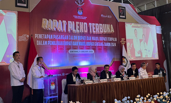 SINTANG, TB – Komisi Pemilihan Umum (KPU) Kabupaten Sintang menggelar Rapat Pleno Terbuka untuk menetapkan pasangan calon Bupati dan Wakil Bupati Terpilih dalam Pemilihan Bupati dan Wakil Bupati Sintang Tahun 2024. Acara tersebut berlangsung di Aula Serantung Waterpark, Jalan Mungguk Serantung, pada Kamis, 9 Januari 2025.