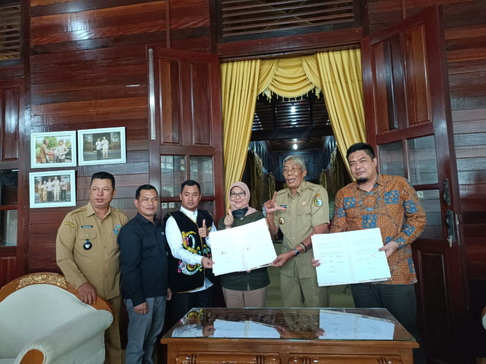 SINTANG, TB- Bupati Sintang, Jarot Winarno, menyaksikan penandatanganan Nota Kesepahaman Bersama untuk mengelola dan melindungi Bukit Tempurung di Desa Bangun antara PT. Kencana Alam Permai, Yayasan Solidardad Network Indonesia dengan masyarakat Desa Bangun yang diwakili oleh Damianus Sukur selaku Ketua Lembaga Pengelola Rimba Tuja Semirah Desa Bangun di Pendopo Bupati Sintang pada Senin, 13 Maret 2023.