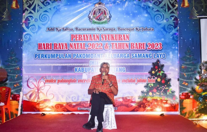 SINTANG, TB- Bupati Sintang Jarot Winarno menghadiri Natal Bersama warga Perkumpulan Pakomoant Keluarga Samang Layo atau Hikayo Kabupaten Sintang di Rumah Betang Jerora Satu Sintang pada Sabtu, 14 Januari 2023.