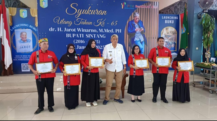 SINTANG, TB – Pemerintah Kabupaten Sintang menggelar acara launching buku Sintang Bersama Jarot dan Pengabdian Tanpa Batas, serta syukuran ulang tahun Bupati Sintang yang ke-65 dan pengabdian 39 tahun Jarot Winarno di Kabupaten Sintang. Acara ini berlangsung pada Rabu, 22 Januari 2025 yang lalu di Pendopo Bupati Sintang.