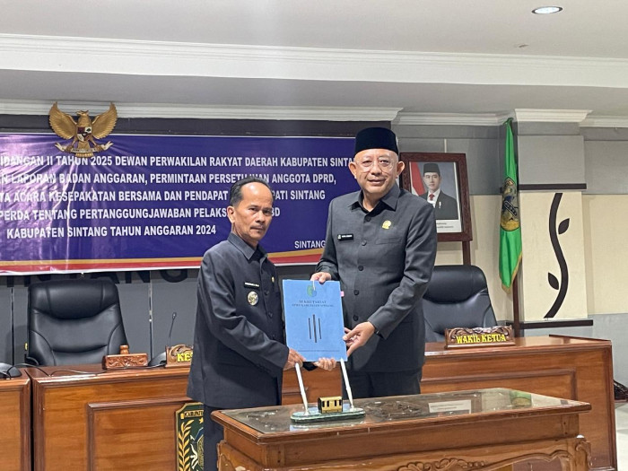 “Setelah kita dengarkan bersama laporan Badan Anggaran terhadap pembahasan Raperda tentang Pertanggungjawaban Pelaksanaan APBD Kabupaten Sintang Tahun Anggaran 2024, selanjutnya dilanjutkan dengan acara kedua, yakni permintaan persetujuan. Untuk itu, perlu saya tanyakan kepada seluruh anggota dewan, apakah saudara-saudari setuju?,” tanya Indra kepada seluruh peserta rapat. “Setuju!” jawab seluruh anggota dewan serempak.