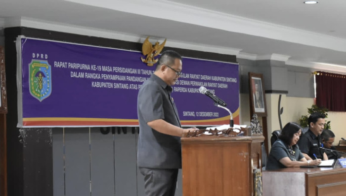 Pandangan umum Fraksi PDI Perjuangan dibacakan oleh juru bicaranya Agustinus di Ruang Sidang DPRD Sintang, pada Senin, 12 Desember 2022.