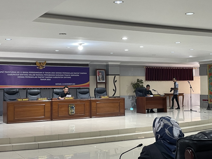 SINTANG, TB – Dewan Perwakilan Rakyat Daerah (DPRD) Kabupaten Sintang menggelar Rapat Paripurna ke-13 Masa Persidangan III Tahun 2022 Dewan Perwakilan Rakyat Daerah (DPRD) Kabupaten Sintang dalam rangka perubahan susunan Fraksi Gerindra Dewan Perwakilan Rakyat Daerah Tahun 2022.